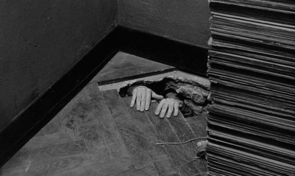 1: spesso le mani, soprattutto quelle di Roland, si muovono con la stessa destrezza di quelle dei borseggiatori in Pickpocket, il grande film di Bresson uscito pochi mesi prima di questo, nel dicembre del 1959. 2: è giustamente famosa la sequenza, lunga quasi 4′, in cui assistiamo prima all’asportazione di quattro assicelle dal pavimento, per scoprire il pavimento in cemento, poi all’azione, a forza di decise martellate, per potervi aprire il primo buco. Non c’è un solo stacco, e vediamo soltanto gli avambracci di tre del gruppo – e le loro ginocchia – mentre a turno eseguono l’operazione. 3: in questo film, come nel succitato Pickpocket, e ancor di più in Un condannato a morte è fuggito, entrambi di Bresson, a me sembra spesso di assistere a una performance assai simile, nella gestualità, a quelle che si vedranno fare, da parte di artisti visivi, a partire dagli anni ’70. Penso soprattutto a quelle di Terry Fox, di Joseph Beuys, poi di Tehching Hsieh e, in tempi assai recenti, di Alis/Filliol, o di Giovanni Morbin, nelle quali il performer fatica e si espone spesso a un rischio reale. Peraltro, tutto ciò che vediamo in questi film è stato realmente eseguito dagli attori (o, nel caso di Pickpocket, comunque da veri borseggiatori all’opera) senza ricorre all’uso di alcun trucco. Addirittura, uno dei cinque, proprio Roland, fa la parte di sé stesso – sotto un falso nome – avendo partecipato, nel 1947, al tentativo di evasione ricostruito prima nel romanzo di Josè Giovanni, quindi nel film di Becker