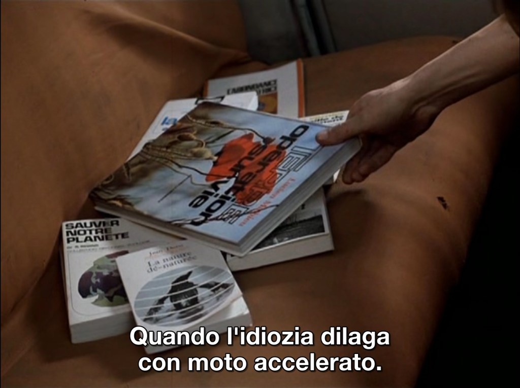 Charles potrebbe dire e fare certe cose ora, non ci sarebbe in questo nessuna stonatura, perfino il suo abbigliamento, e il suo taglio di capelli, non appaiono troppo datati, ovvero: erano differenti rispetto alla norma allora, lo sarebbero – sia pure forse in misura assai maggiore – anche adesso. Quando, parlando con lo psichiatra che cerca inutilmente di metterlo in difficoltà con le sue domande, enumera una serie di comportamenti ‘normali’ (o normati) a cui aderiscono tutti, essi sono grossomodo gli stessi – con l’aggiunta di molti altri, nuovi – messi in pratica ai nostri tempi (“Perdendo la vita, ecco che cosa perderei: il piano famiglia, le vacanze organizzate, culturali, sportive, linguistiche, la biblioteca dell’uomo colto, tutti gli sport, come adottare un bambino, le associazioni dei genitori, degli insegnanti e degli alunni, l’insegnamento, educazione da 0 a 7 anni, da 7 a 14 anni, da 14 a 17 anni, educazione propedeutica al matrimonio, gli obblighi militari, l’Europa, le decorazioni, i distintivi, onorificenze, la donna sola, le malattie per assistiti, le malattie dei non assistiti, l’uomo di successo, esoneri fiscali per persone anziane, le tasse comunali, la cessione del quinto, i canoni radiotelevisivi, credito concesso al consumo, riparazione a domicilio, indicizzazione dei contratti, IVA e ritenuta d’acconto“.), lo fa con una specie di sorriso sarcastico (sarcasmo che informa di sé anche il tono di voce), amaramente, in un crescendo che quasi gli toglie il fiato, talmente è incalzante. E noi sappiamo – io per lo meno so – che è proprio così: è tutto falso, sfinente, demoralizzante, annichilente. Allora perché continuare su quella strada, perché non sottrarvisi il più possibile, attuando l’unica arma di difesa in nostro (teorico) possesso: la rinuncia, attuata con l’uscita dal gregge che procede con occhi e orecchie coperti verso il nulla, la catastrofe che si materializzerà proprio così, grazie alla complicità inconsapevole e incessante della massa delle persone che compongono la società. Charles compie l’atto di rinuncia estremo dopo aver capito che ogni altro comportamento sarebbe inane e del tutto inutile, come sparare colpi di pistola nella Senna, e dopo aver constatato che nessuno può fare più alcunché di efficace per invertire la tendenza, né con nessuno è più possibile conversare (dal latino, ‘trovarsi insieme’) e rimarrebbe quindi, dopo l’apatia, soltanto il mutismo e infine il silenzio. Così si suicida con l’aiuto, a pagamento, del tossicomane Valentin, che gli spara alle spalle mentre sta finendo di pronunciare l’ultima frase, «Credevo che in un momento così grave avrei avuto dei pensieri sublimi… Vuoi sapere cosa penso?».